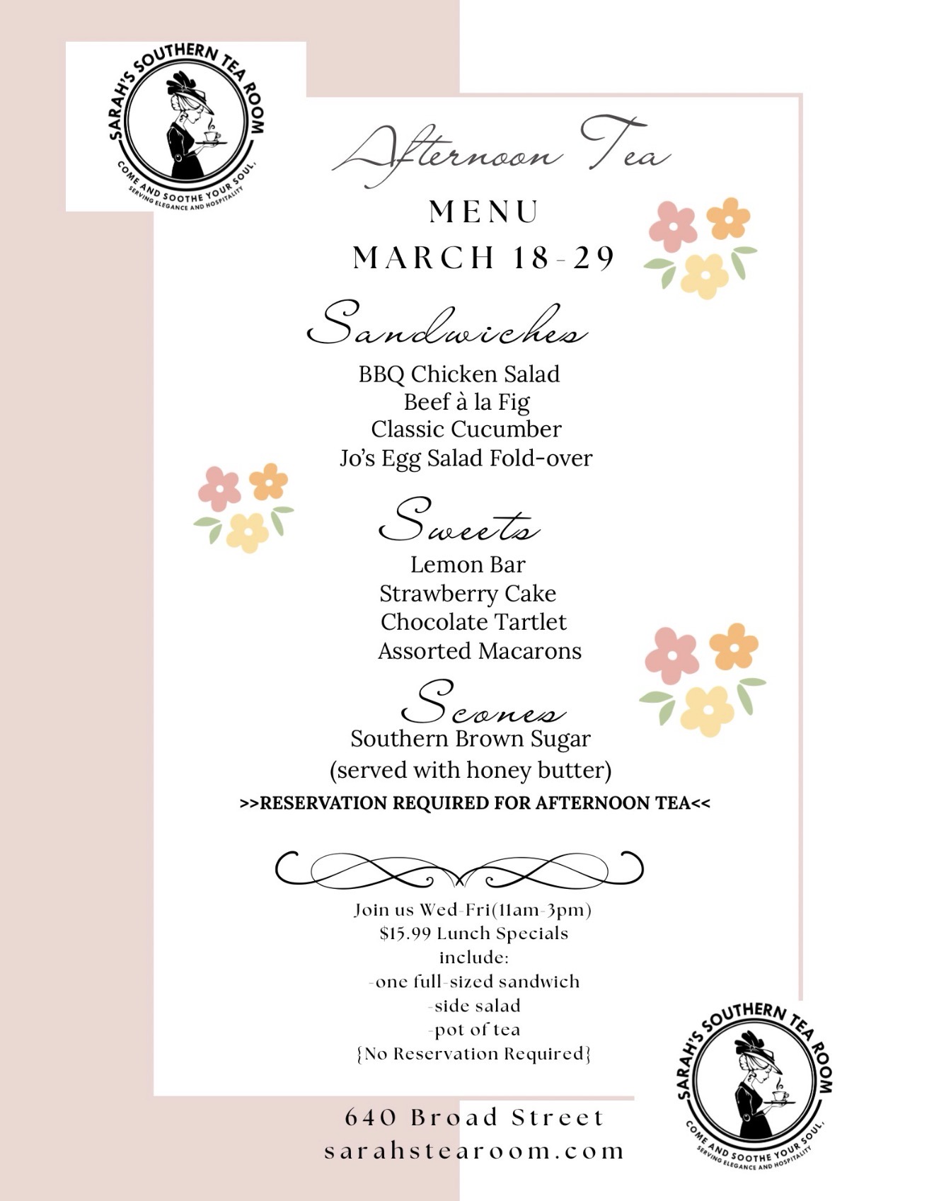 At Sarah’s Southern Tea Room, our menu rotates bi-weekly to reflect the freshest seasonal ingredients and our chef’s inspired creativity. Each dish is crafted to pair beautifully with our selection of premium teas and to bring comfort and elegance to your table.